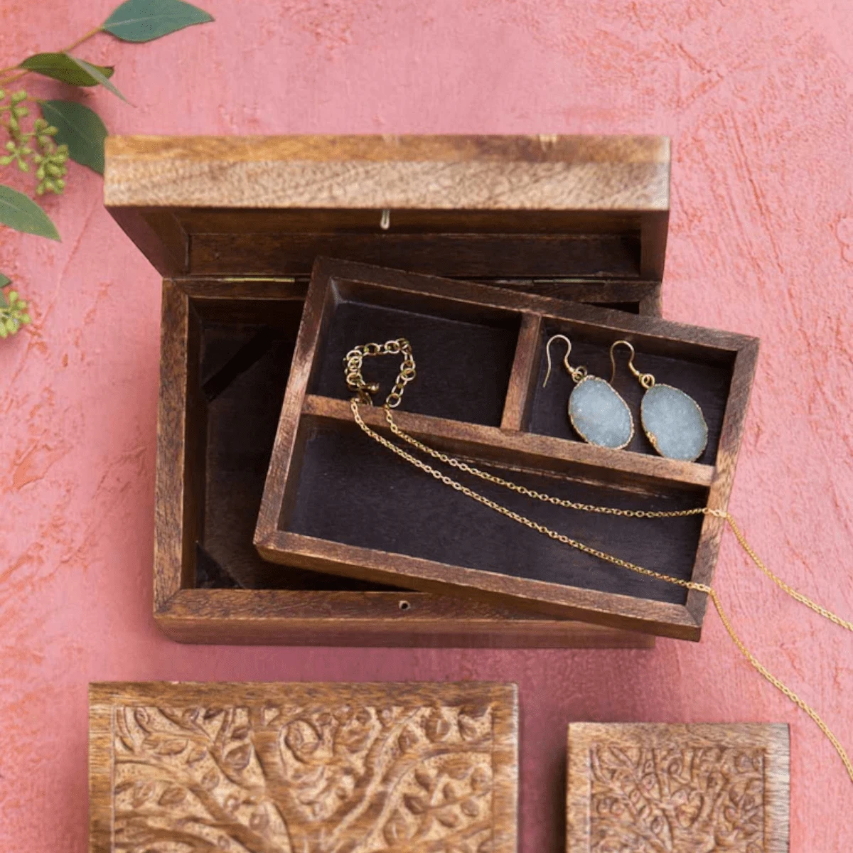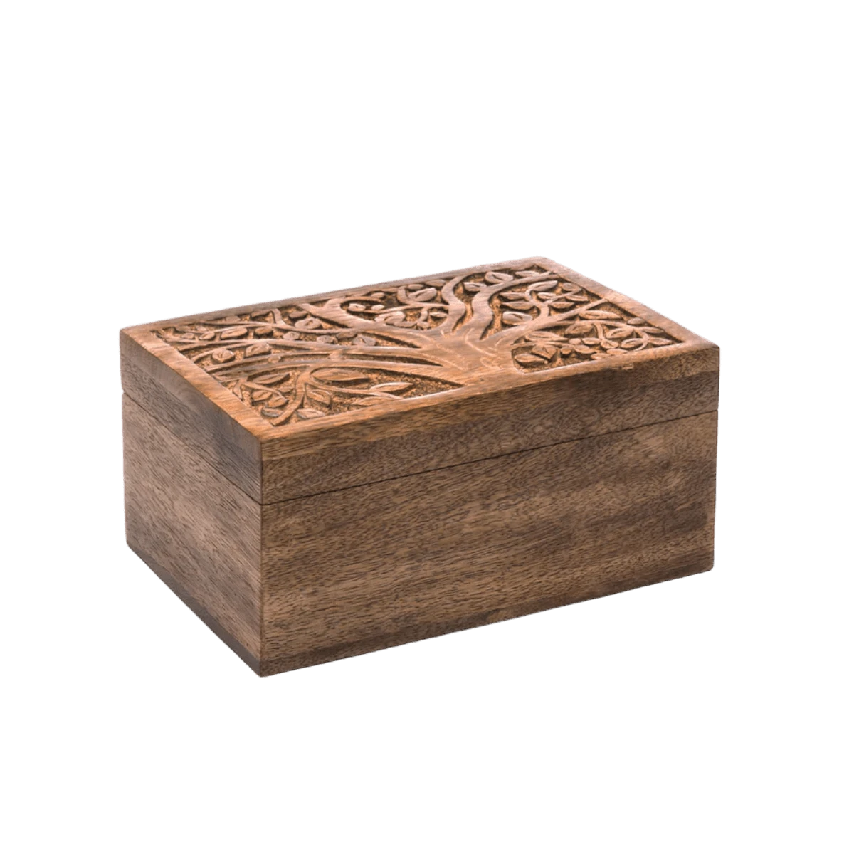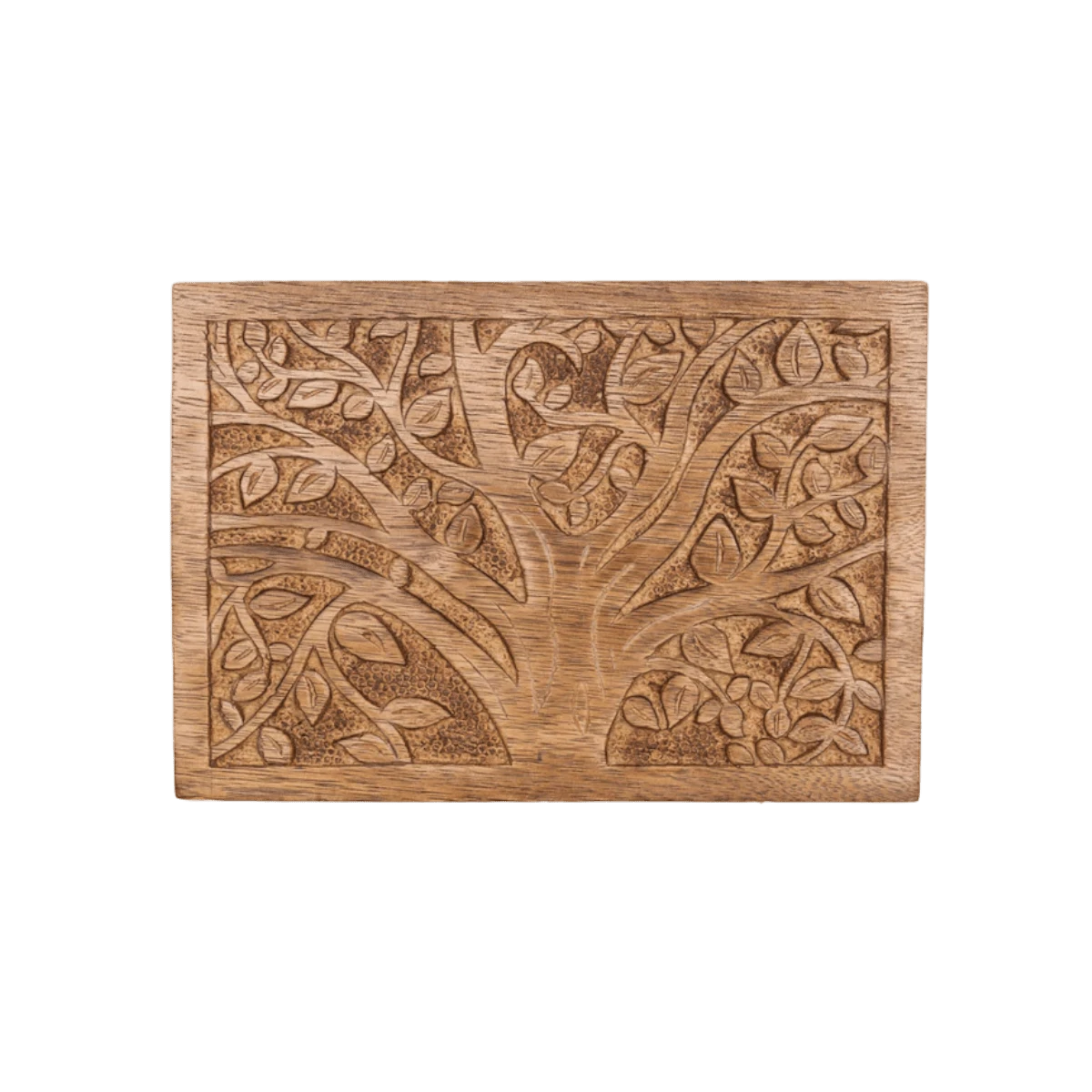Ethically sourced mango wood box and hand carved tree of life design honoring Forest Goddess Aranyani. Store keepsakes neatly organized in this sustainably handmade jewelry box, with removable three compartment tray inside. Versatile gift for people for a variety of special occasions.