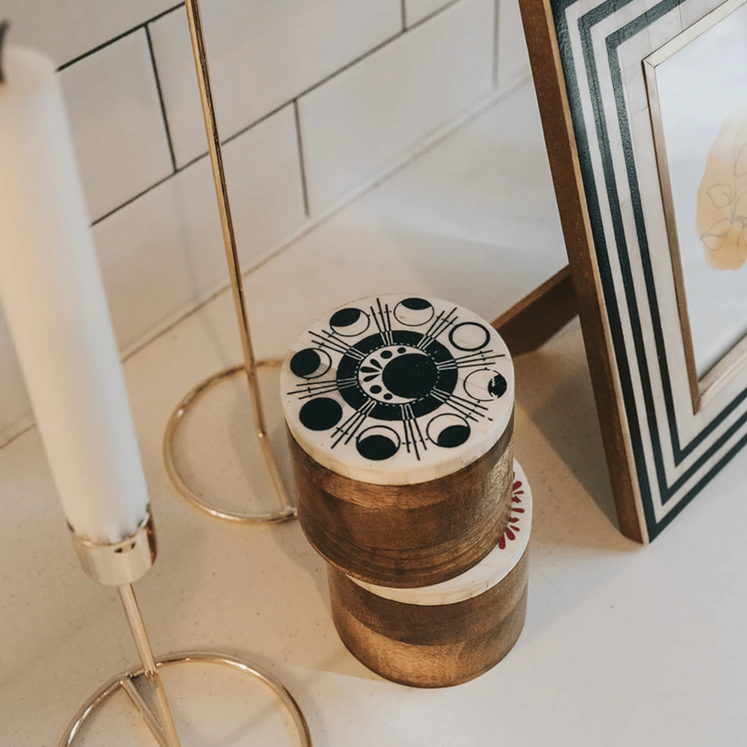 Our Banaj Moon Phase Keepsake Box is artisan-crafted from sustainably harvested mango wood and ethically sourced bone, featuring a hand-detailed, floral-inspired design and a blooming lunar-phase lid. Hand-carved by master artisans in Old Delhi, this thoughtfully designed box is the perfect stylish place for safekeeping of small items.