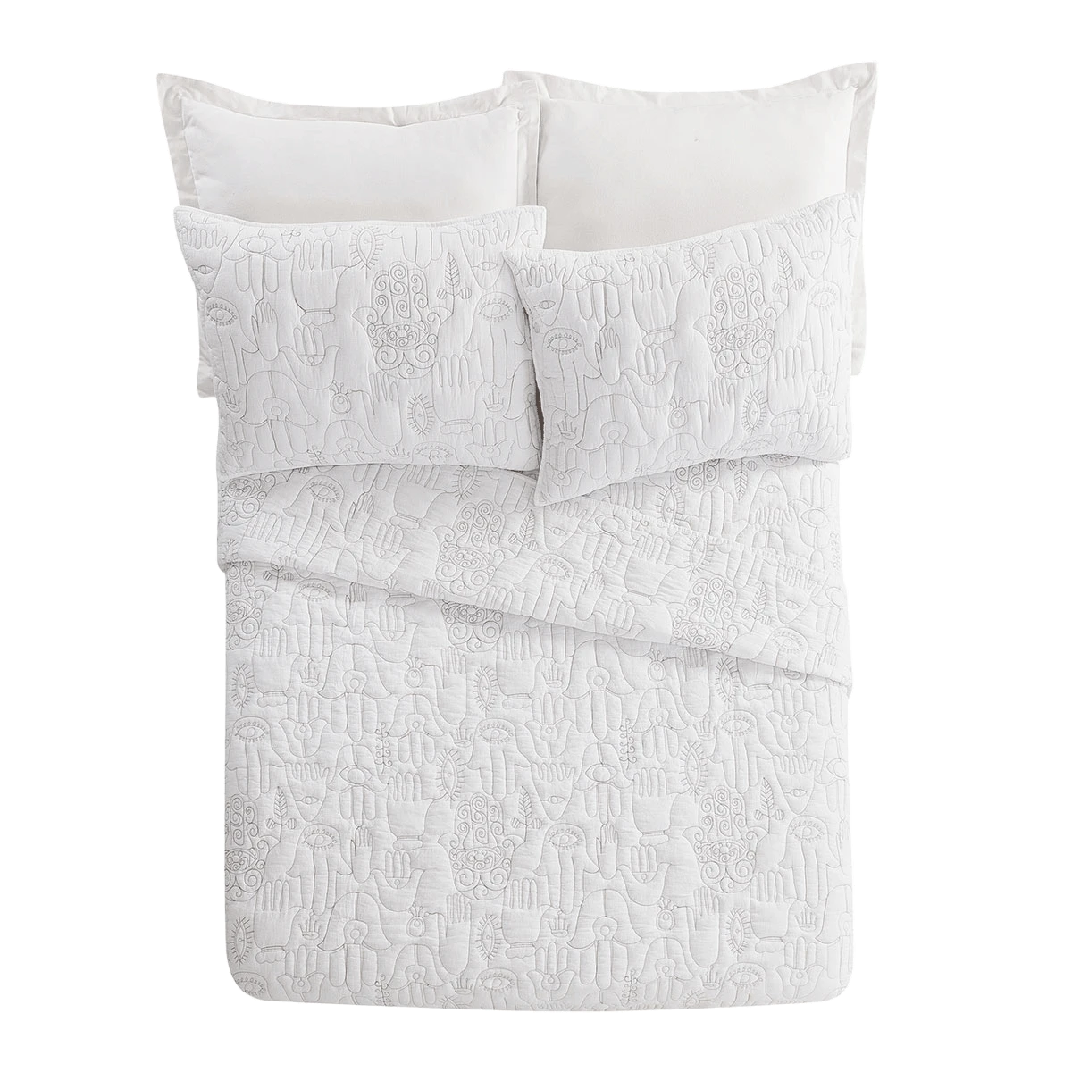 This mega-cozy quilt set is adorned with embroidered, hand-drawn illustrations of hamsas from Justina’s own hamsa amulet collection from her global escapades. The hamsa, also known as the Hand of God or the Hand of Fatima, is an ancient amulet symbolizing protection, happiness, luck, health and good fortune. What better way to establish good vibes in your abode than to wake up in that sorta goodness on the reg?