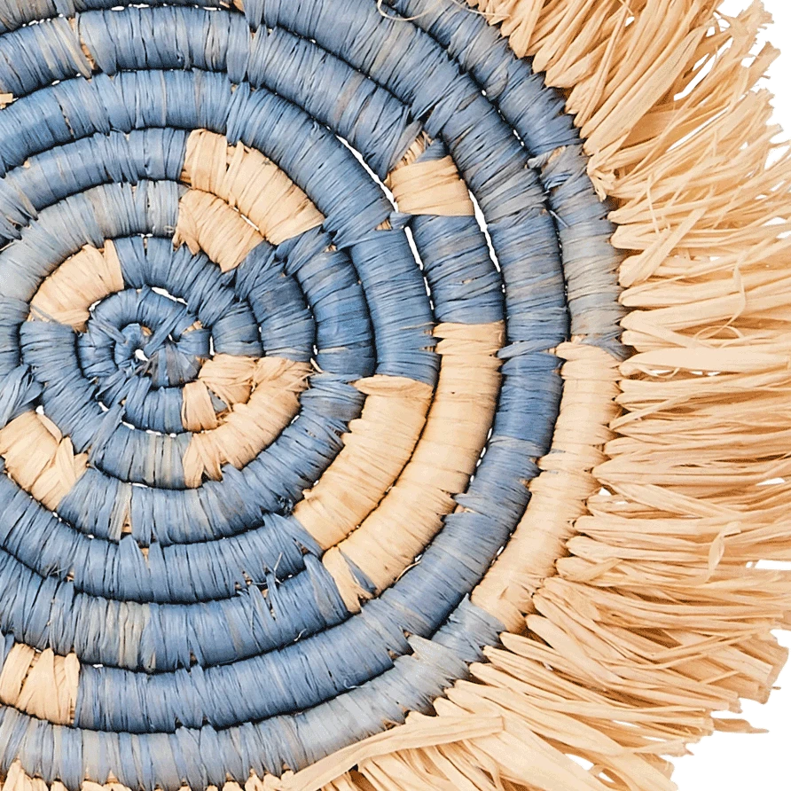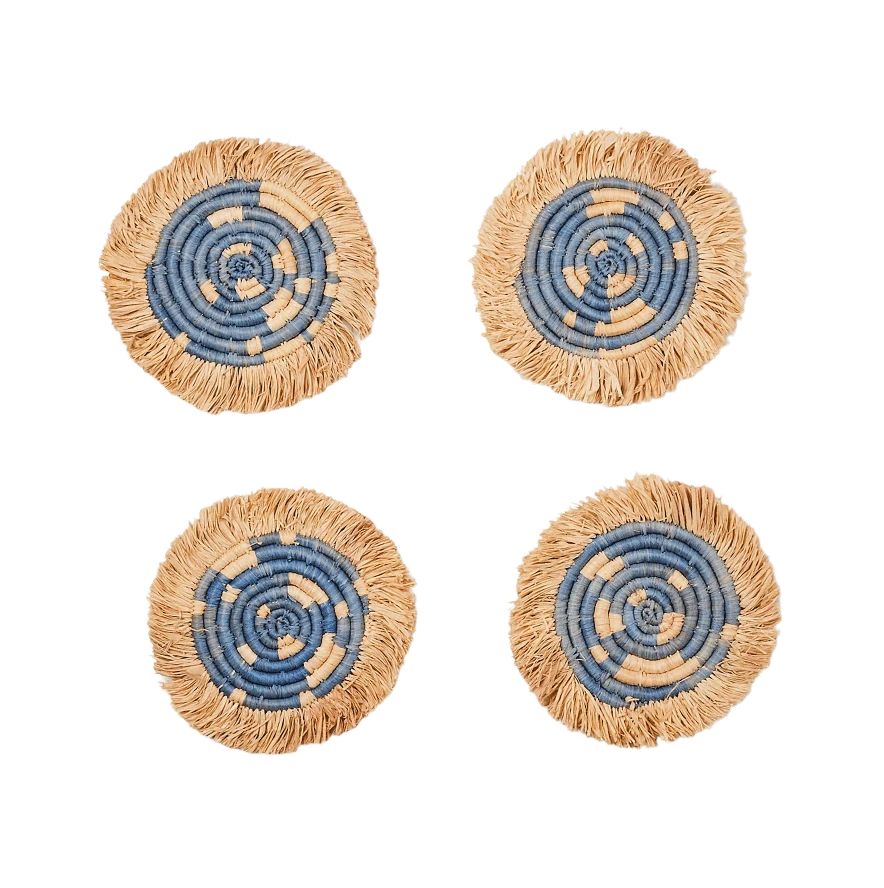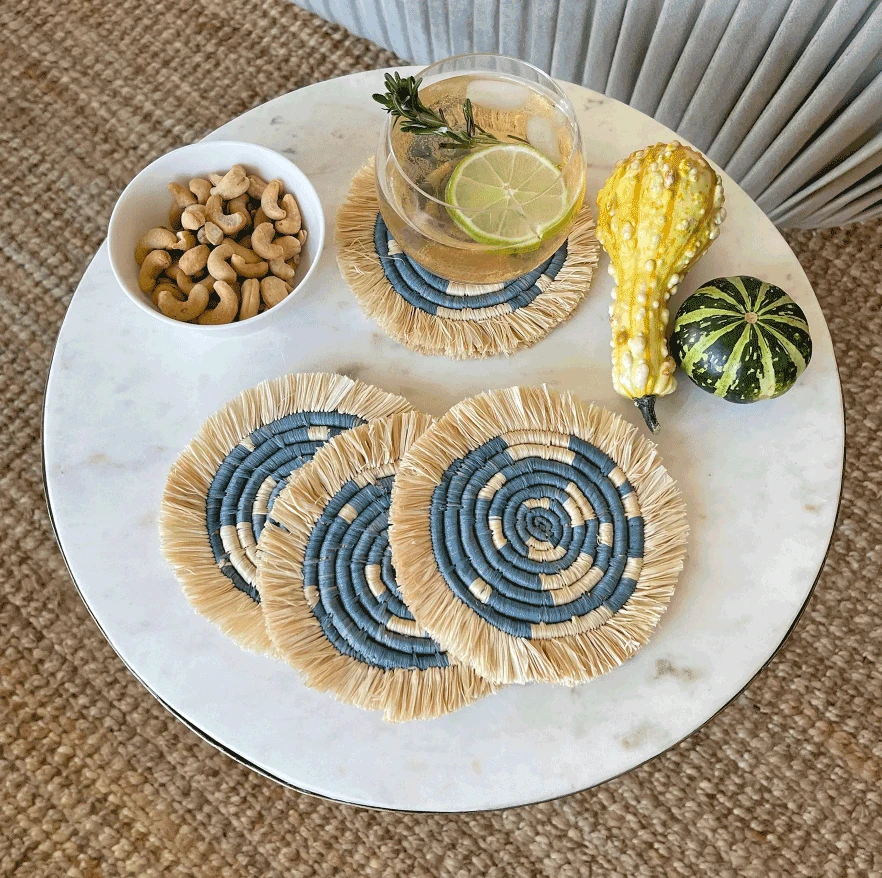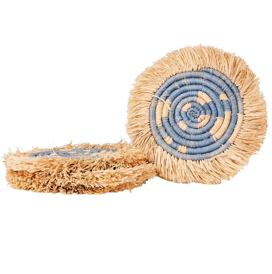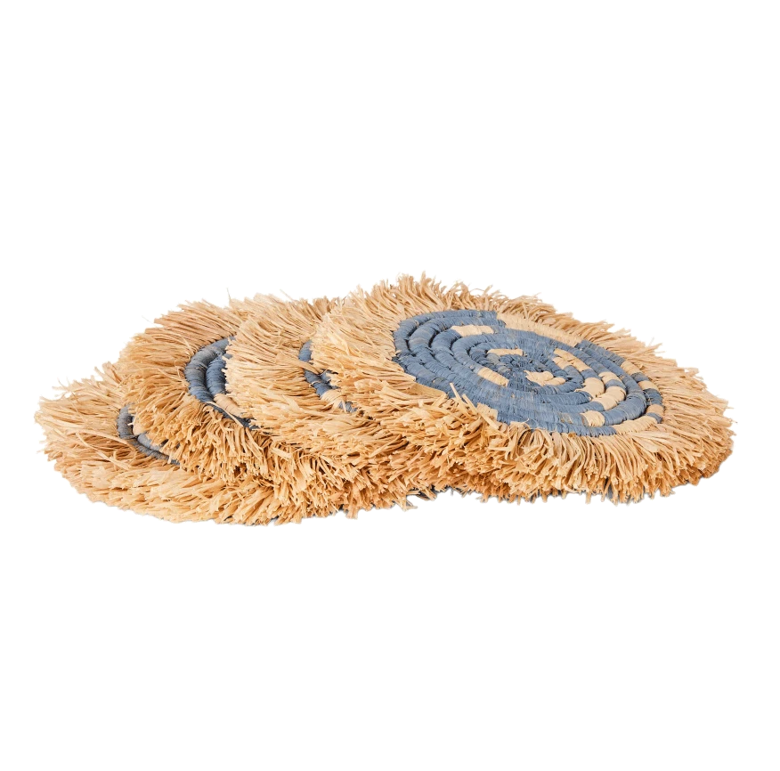 Intricately crafted with timeless tradition, this carefully dyed sisal fiber and sweet grass fringe coaster set makes a bold and exciting statement piece.