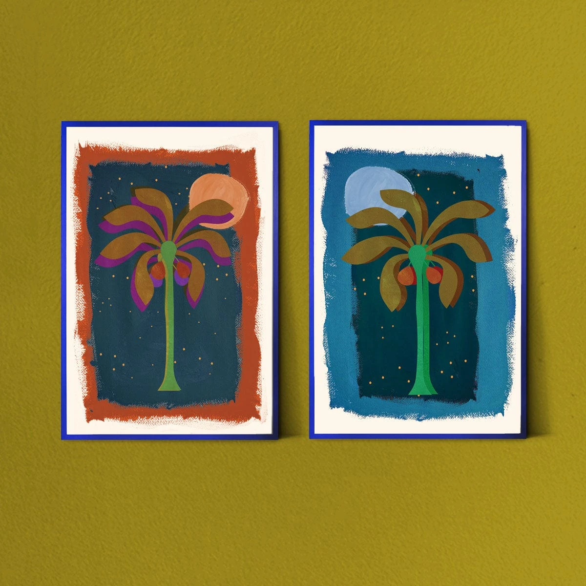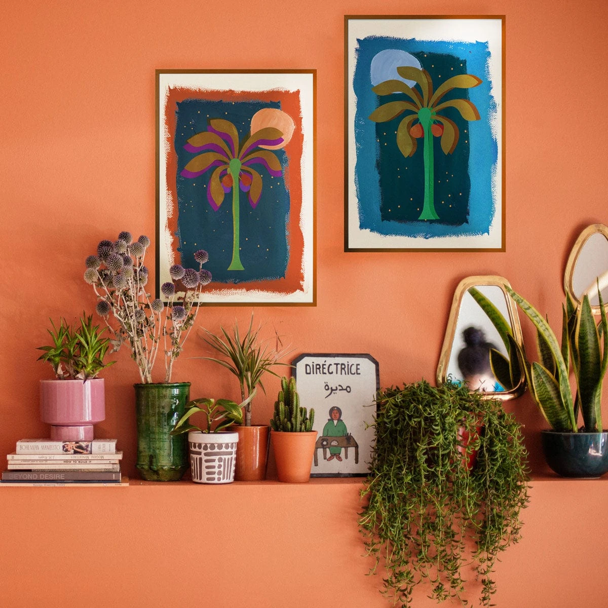 Date Night Moon Art Print by Jungalow® celebrates the beauty and magic of the date palm. In dry desert climates, these glorious trees still grow and flourish and provide nature’s perfect sweetness in their fruit.