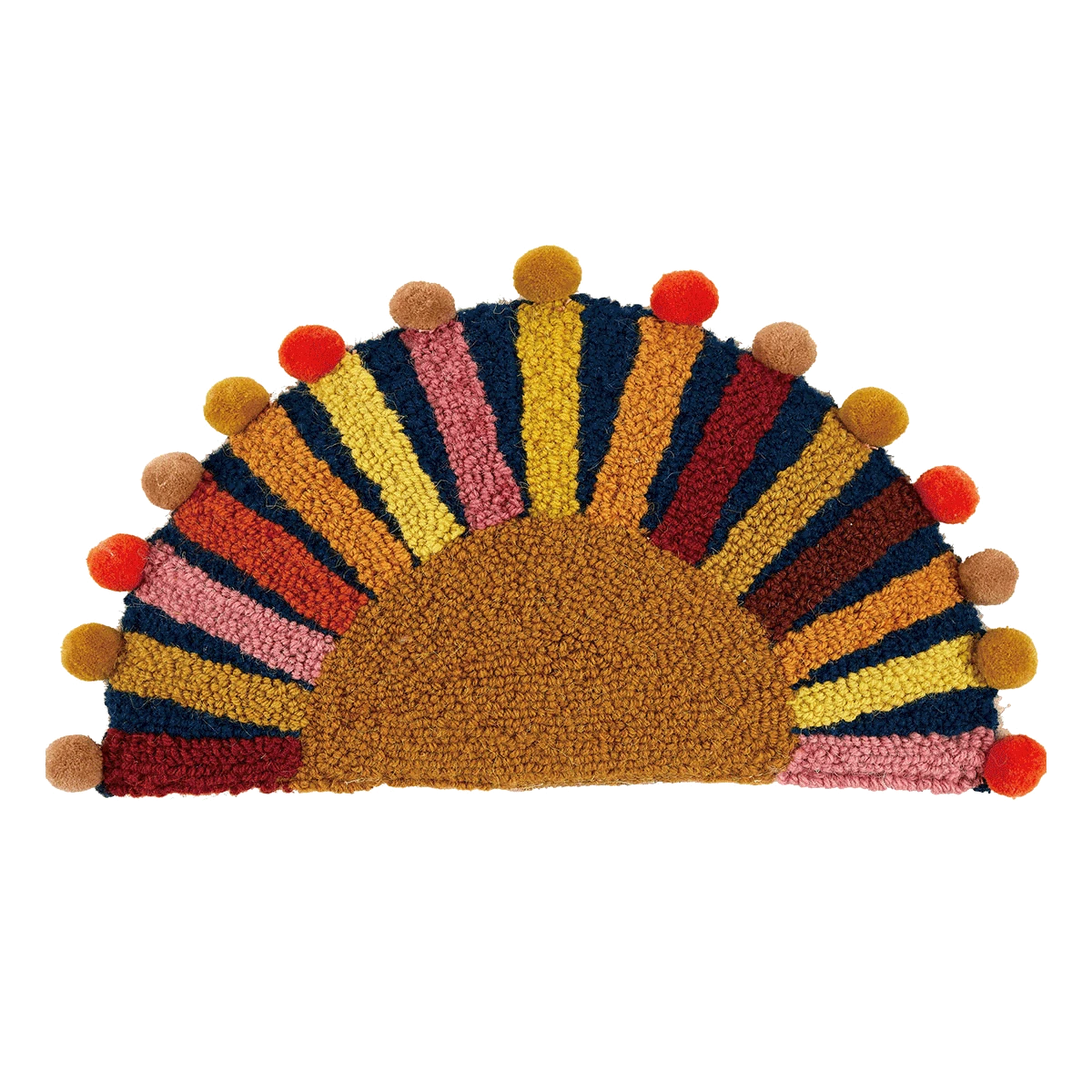 Our Good Day Sunshine Hook Pillow features rays in red, pink + gold on a navy base. Each ray is adorned with fun colorful pom pom! This pillow will definitely bring good vibes home.