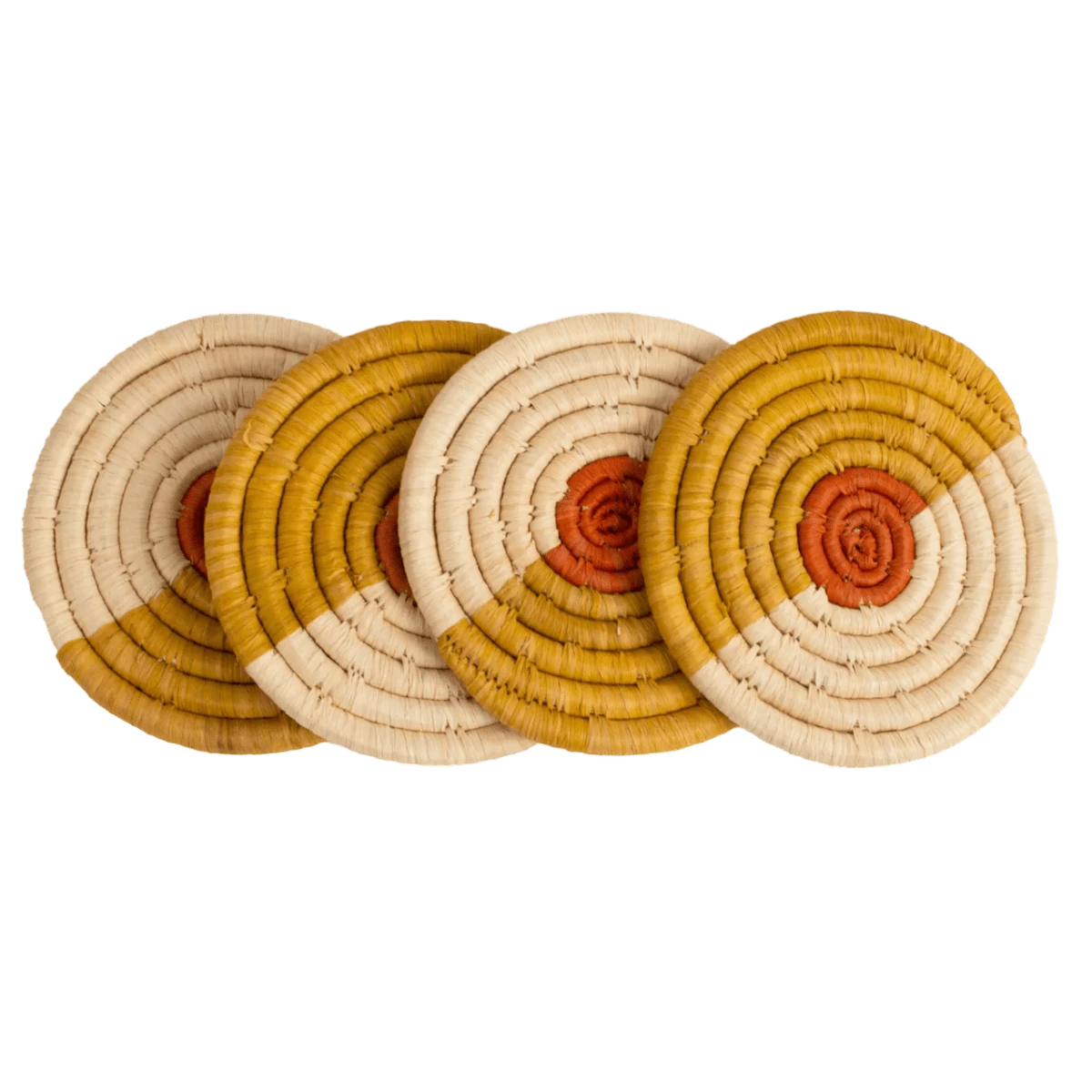 Intricately crafted with timeless tradition, this carefully dyed sisal fiber and sweet grass coaster set makes a bold and exciting statement piece.
