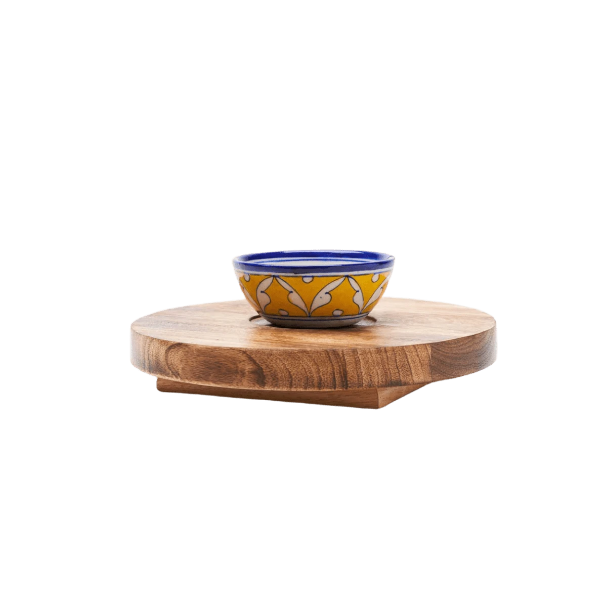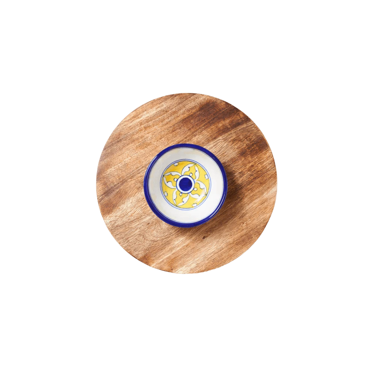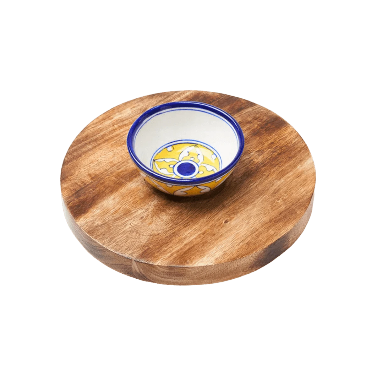 Enhance your hosting experience with this expertly handcrafted, eco-friendly circular cheese tray and bowl set. This attractive set combines the finest quality Rajasthani pottery with a circular cheese tray hand carved from sustainably harvested mango wood. The cheese tray features a tasteful carved space to support the ceramic bowl. The art of traditional Indian wood craft requires mastery, passed down through generations, to create intricately hand carved treasures from solid blocks of mango wood. The bowl is handcrafted by the master artisans from Blue Pottery of Jaipur, with intricately hand painted detail and lead-free glaze. Featured designs are a rich expression of traditional Indian design motifs. Intentionally designed and handcrafted, this is an ideal gift for your favorite host or new homeowner.