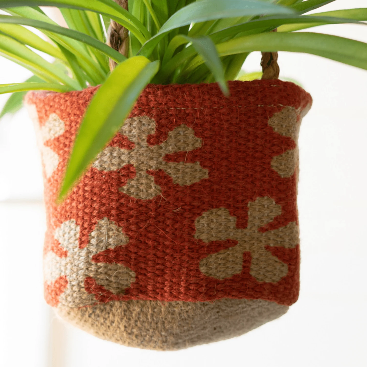 Bring vibrancy to any room with this set of three Mathus Printed Jute Hanging Planters. Crafted with durable jute, these planters come in blue, purple, and coral, and are designed to hang from the ceiling or wall. Each planter is made in India and coordinates with floor planters for a dynamic look.