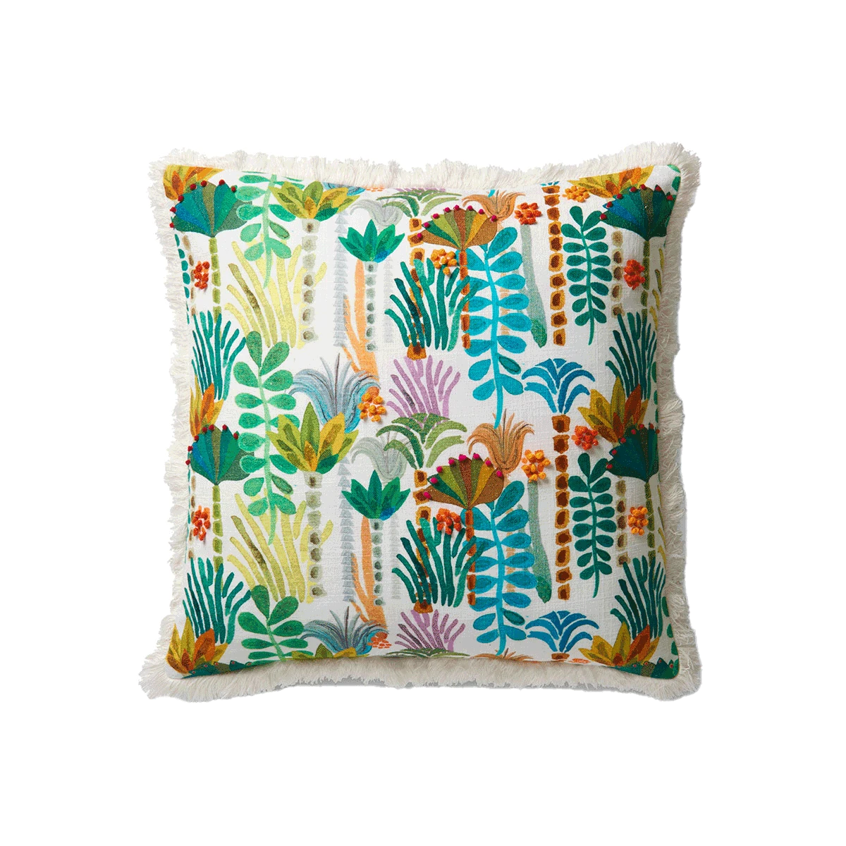 This bohotastic design was brought to life with original watercolors by Justina and inspiration from the tall palm trees lining the streets & sand in Santa Monica, CA. The whimsy motif is embroidered on with various, colorful hues making it a super jungalicious statement pillow.