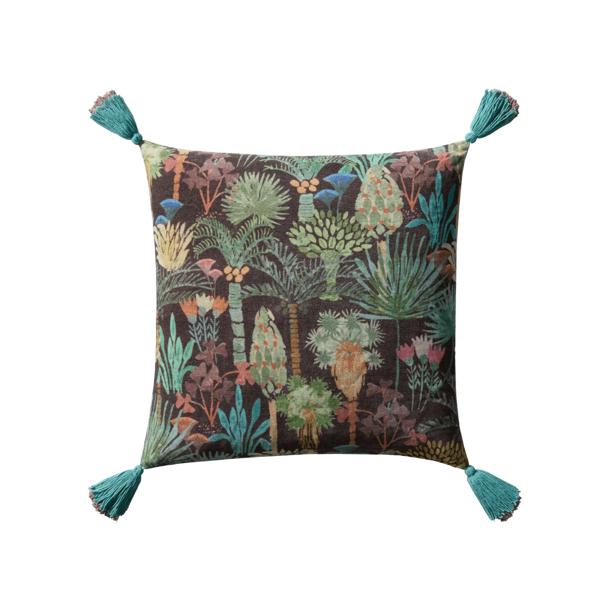Our bestselling Phoenix pattern is featured on this vibrant pillow with turquoise and pink tassels at the corners.
