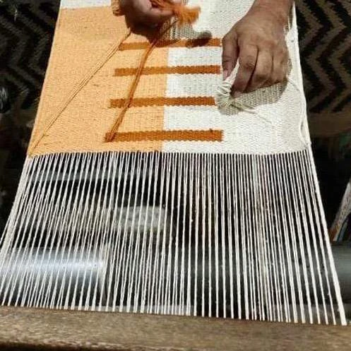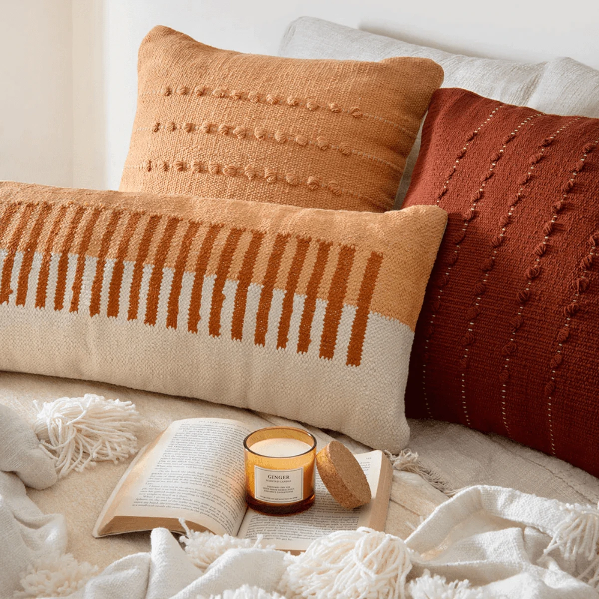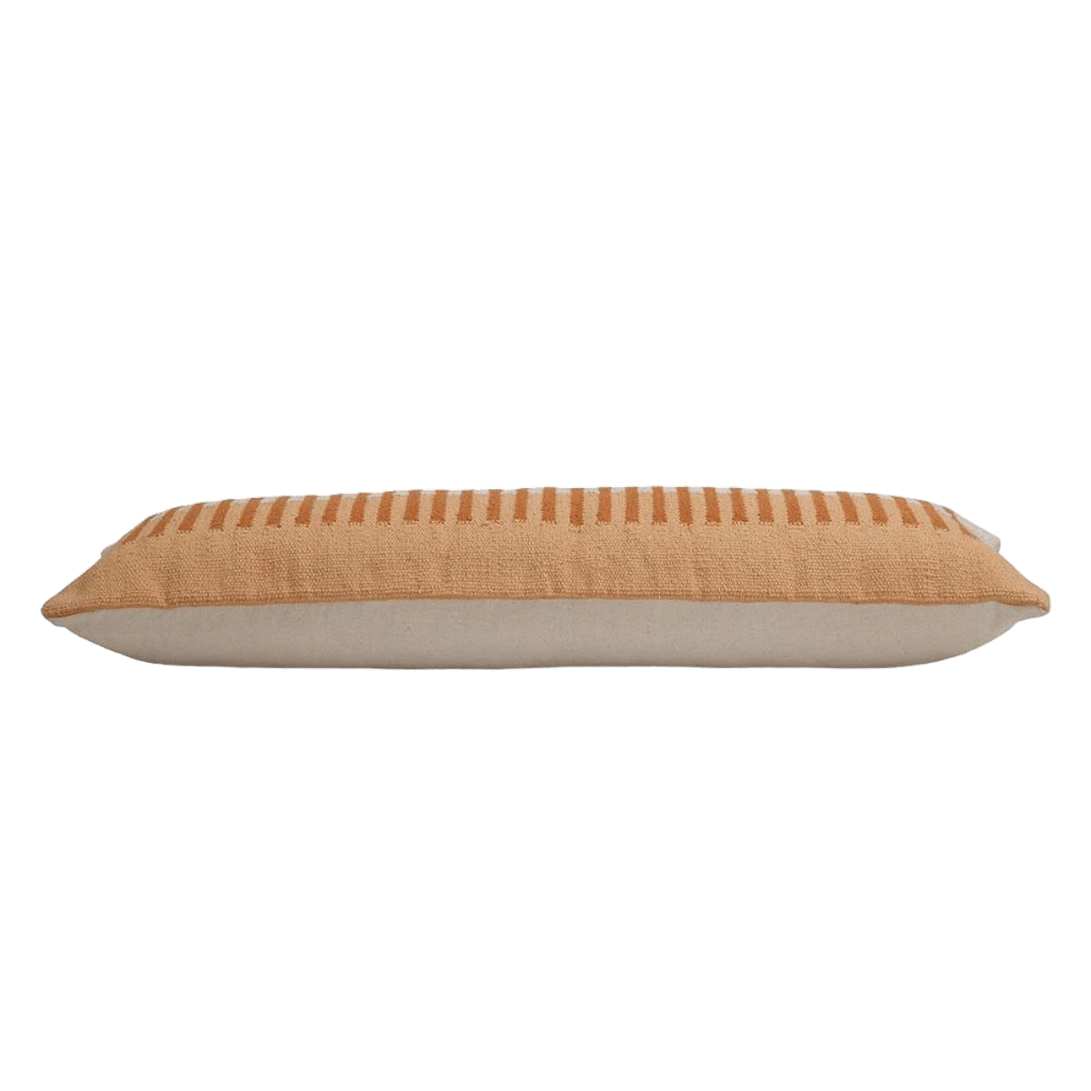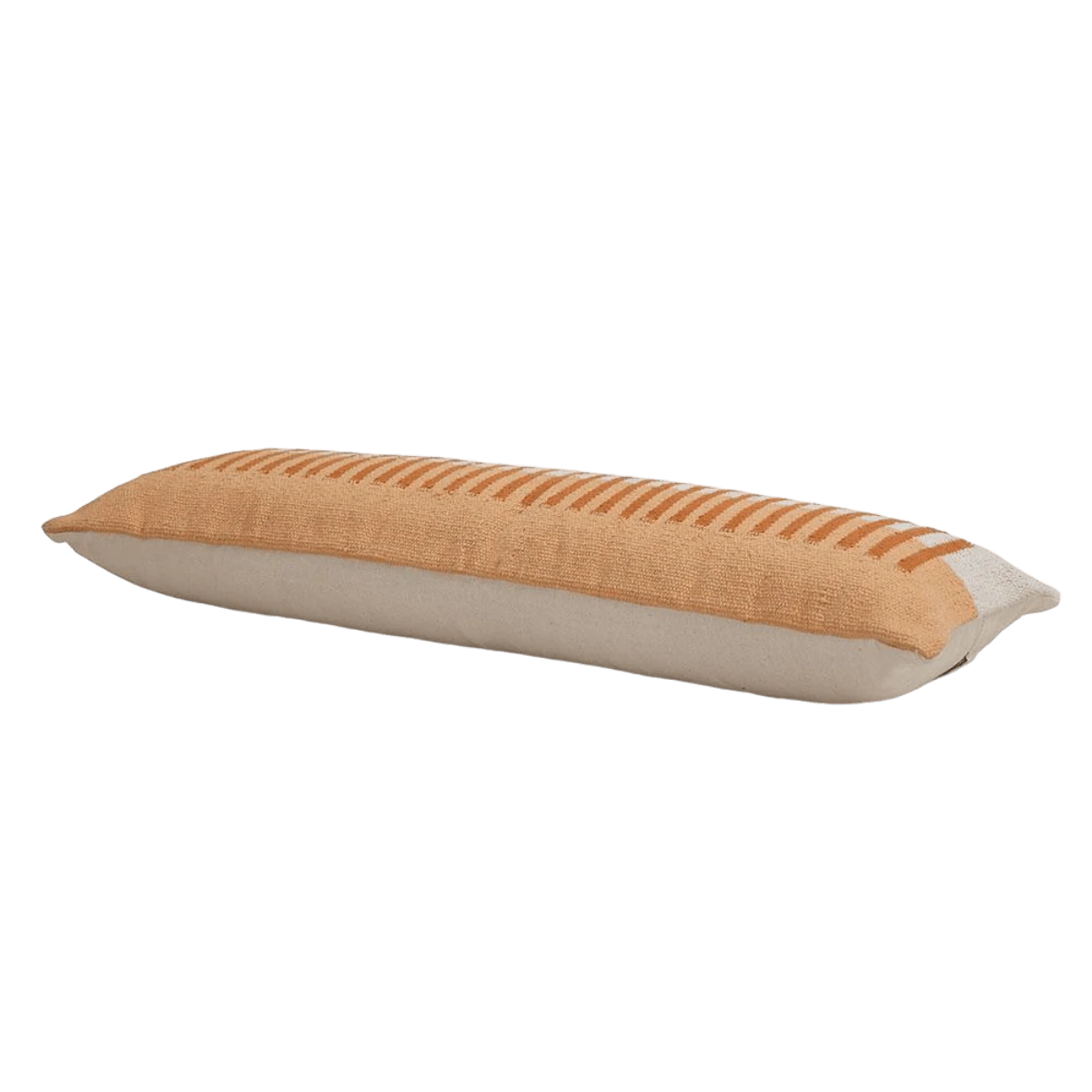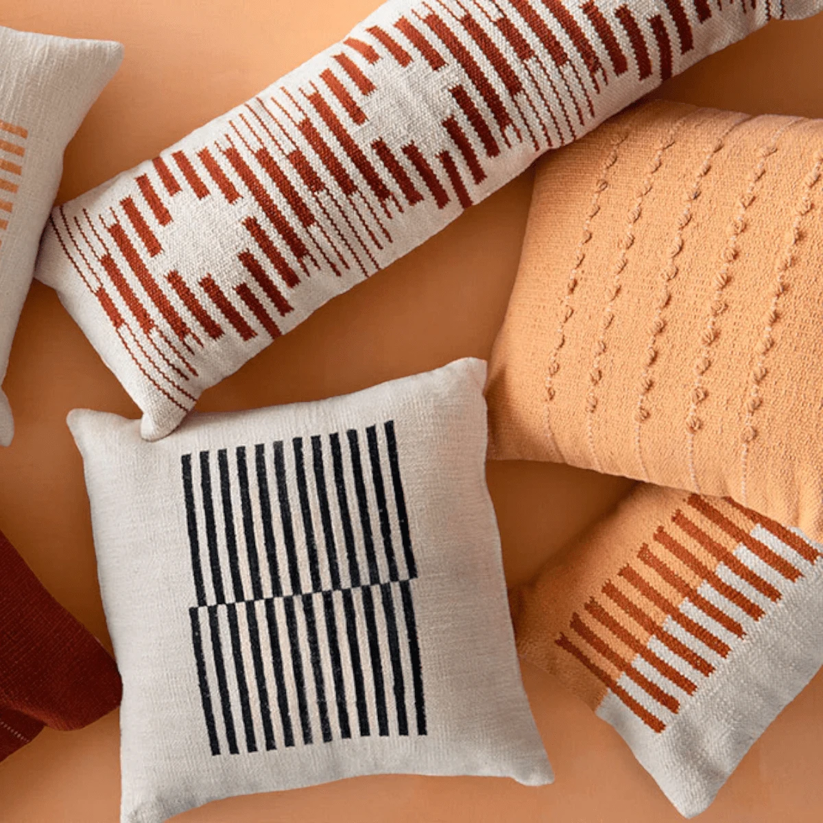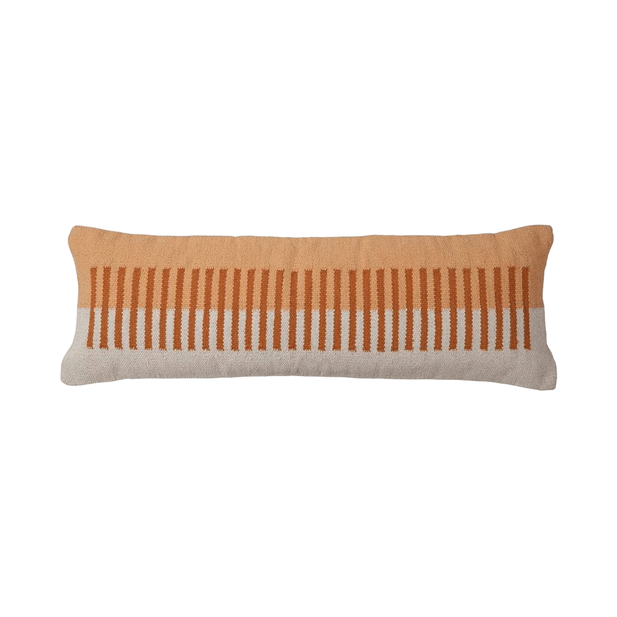 This pillow takes its inspiration from the colors of the sunset. Handmade by master weavers on pit looms, artisans use traditional Indian weaving techniques.
